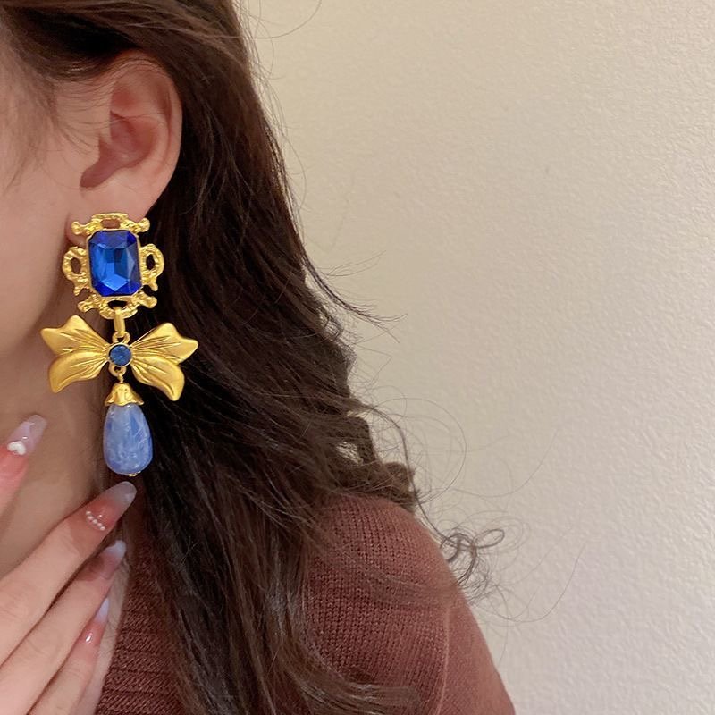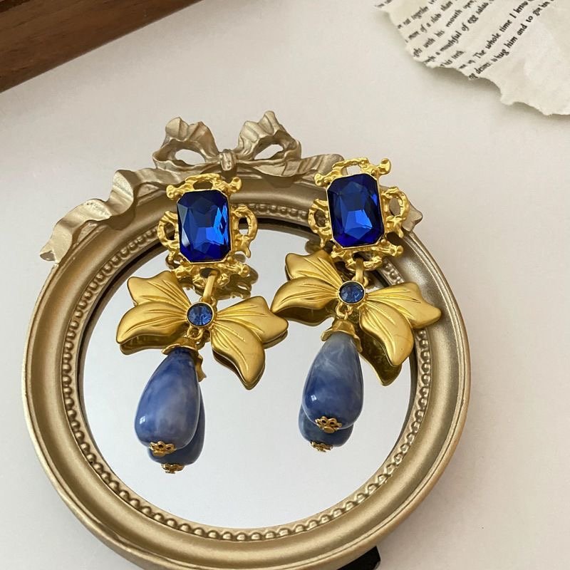 Silver needle dark blue diamond earrings retro